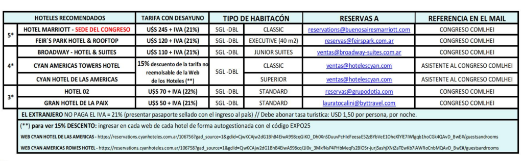 1) Por correo electrónico aventas@hotelescyan.com (Cyan de las américas o Cyan tower) indicando que son asistentes al evento CONGRESO COMLHEI y código EXPO25 2)- A través de la web de cada hotel de forma autogestionada con el código EXPO25, seleccionando la opción código de descuento/eventos.